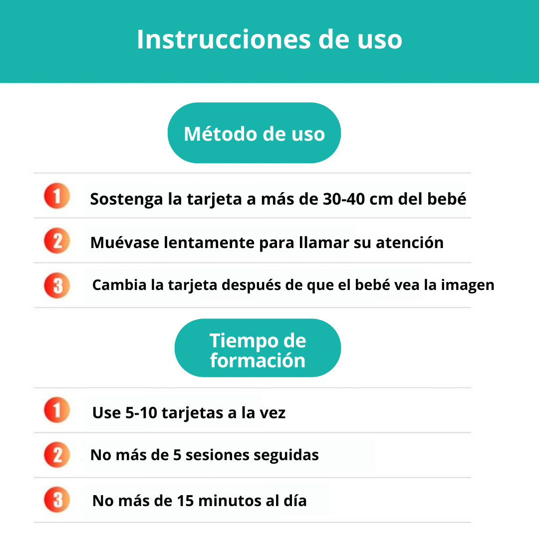Sostenga la tarjeta a unos 30-40 cm del bebé y muévase lentamente para atraer la mirada del bebé y después de que el bebé mire la tarjeta durante 5-6 segundos y luego cambie a la siguiente tarjeta. Recomendamos usar de 5 a 10 tarjetas a la vez.